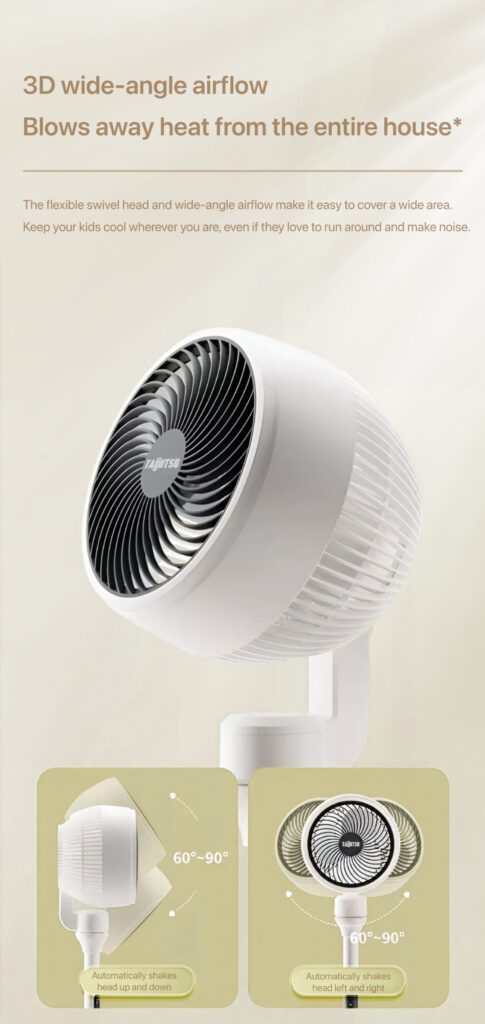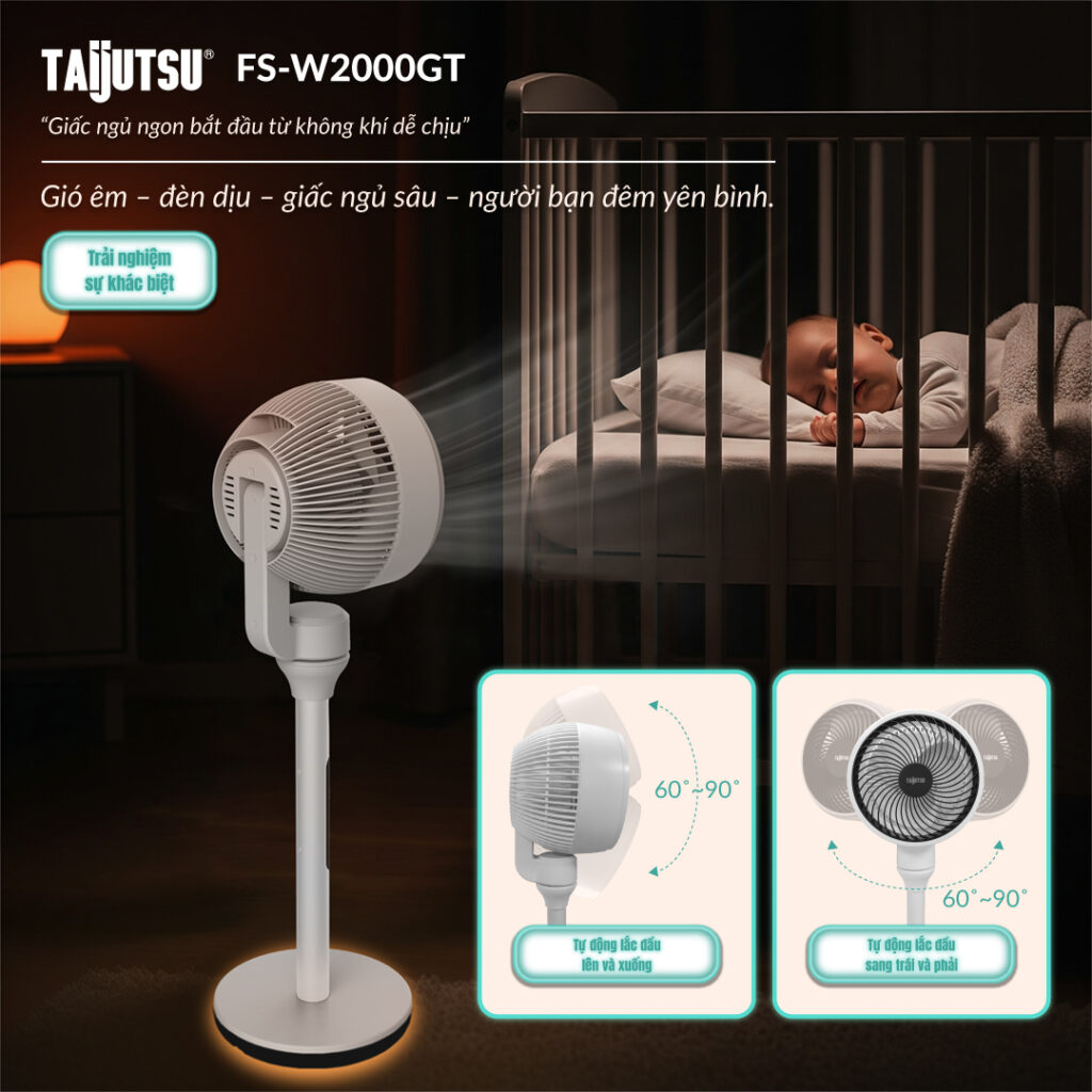 Khả năng xoay 360 độ giúp quạt phủ đều luồng gió đến mọi ngóc ngách trong phòng. Dù bạn đang ngồi ở góc làm việc, nằm trên sofa hay ở góc phòng xa, Taijutsu FS-W2000GT vẫn đảm bảo không khí được lưu thông liên tục, tạo cảm giác mát mẻ đồng đều – không cần phải di chuyển quạt theo hướng thủ công như các dòng truyền thống.